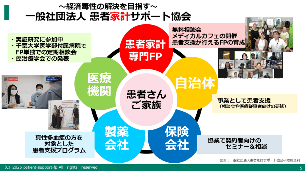 そこで、経済毒性の問題解決を目的とした支援機関の設立と、FPの育成事業を行うため、千葉県内でがん患者支援に携わる3名のFPが、2023年4月に「一般社団法人 患者家計サポート協会」を立ち上げました。