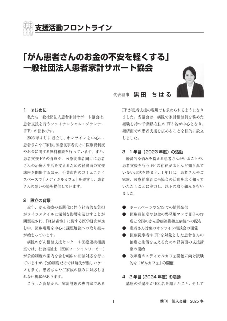 協会理事は病院のがん相談支援センターと協働で患者さんからの家計相談を受けている全国でもまだ珍しいFPで、医師とともにがん治療の経済毒性の研究にも参画しております。