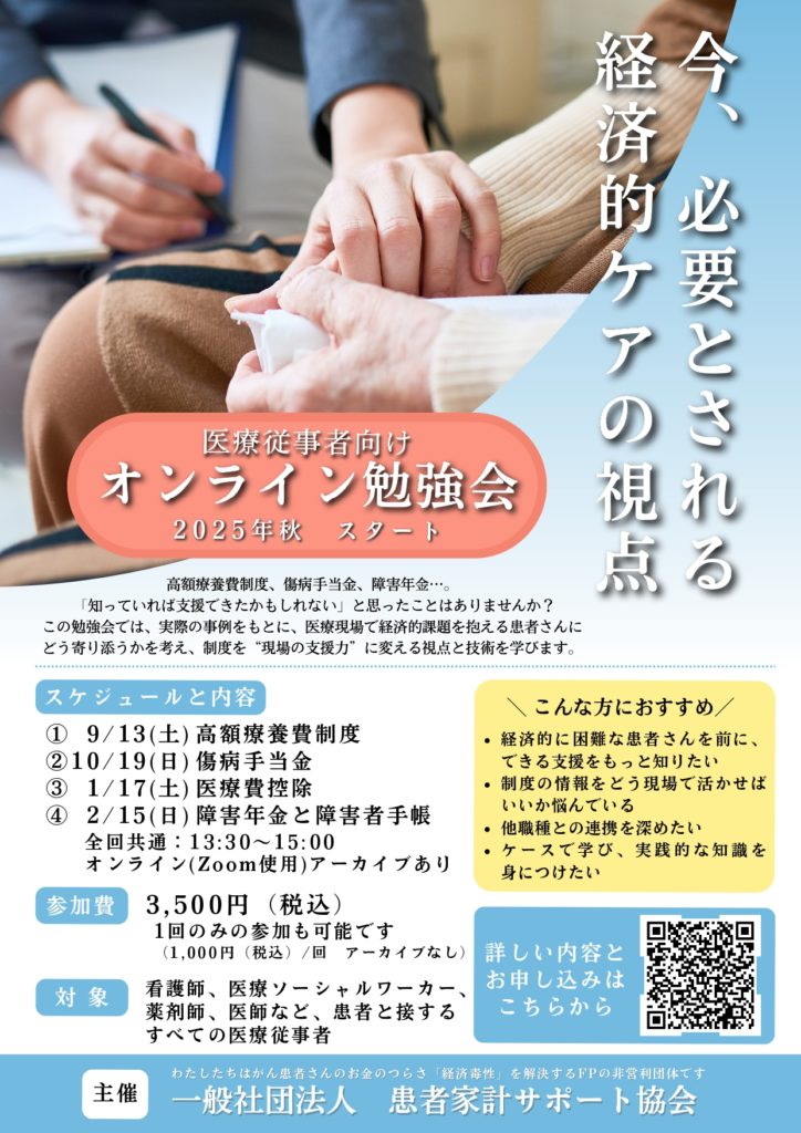 ※医療従事者としてではなく、FPとしての専門性を深めてアドバイスされたいという方は、このプロジェクトではなく、患者家計アドバイザー会員をご案内しています。ご希望の方は協会事務局info@patient-support-fp.comまでご連絡ください。